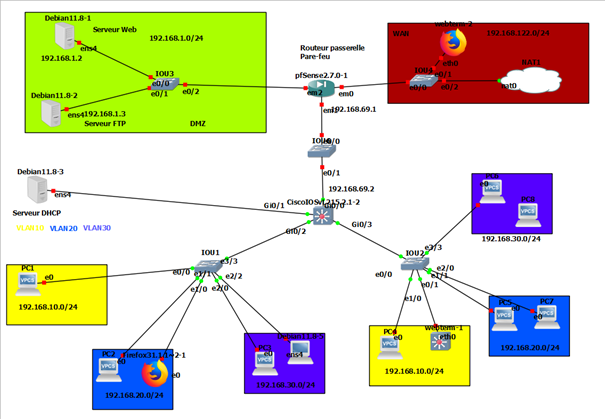 Installation et configuration d’un pare-feu : si cela s’avère nécessaire, penser à se connecter directement avec un objet webterm ou Firefox pour avoir accès à l’interface web de pfSense. Utiliser le TP de configuration de pfSense.